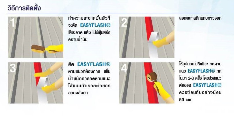 EasyFlash สามารถทดแทนการปิดครอบแนวรอยต่อแบบเดิมที่ใช้ Metal Flashing โดยเฉพาะจุดที่ซ้อนทับระหว่างแผ่นโปร่งแสงกับ Metal Sheet ซึ่งพบปัญหารั่วซึมและผุกร่อนจากสนิมของวัสดุ Metal Flashing หลังการใช้งาน รวมถึงจุดแนวต่ออื่นๆ ที่ Metal Flashing ไม่ได้ขนาดทำให้เกิดการซ้อนที่ไม่แนบสนิทกันของ Metal Sheet และเกิดการรั่วซึมหลังการติดตั้ง